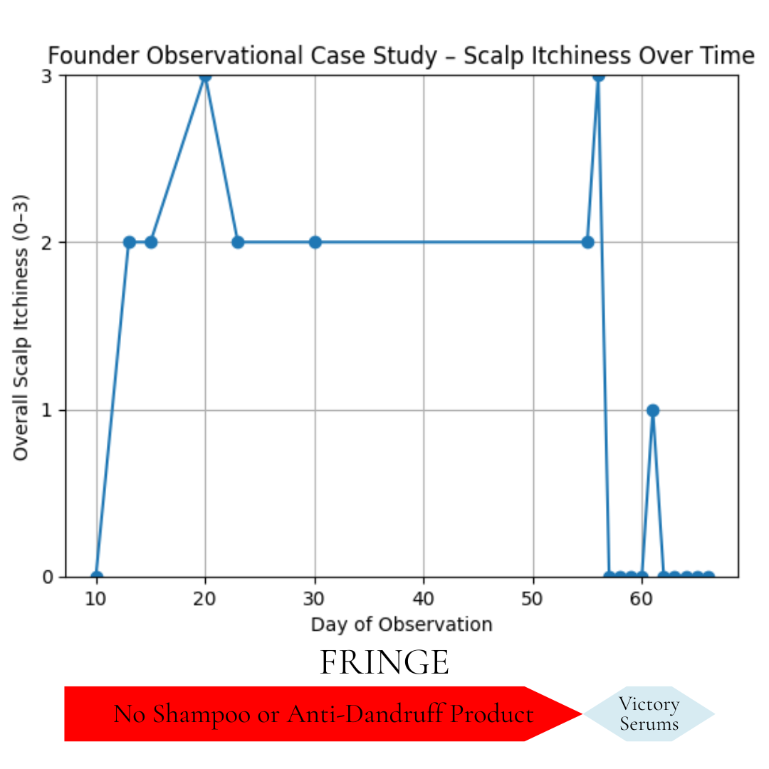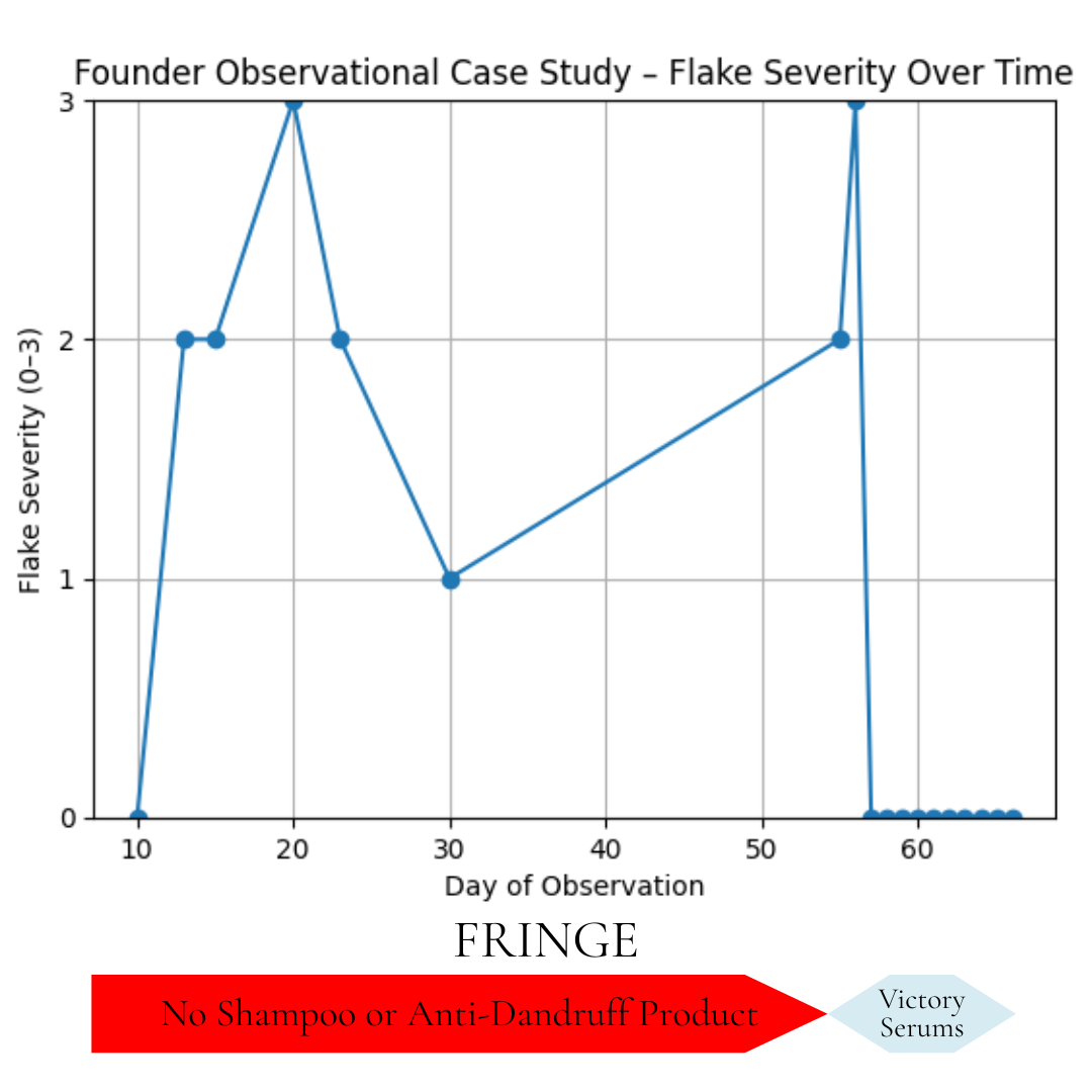 1. This was not a clinical trial but rather a personal experiment conducted at home over a few months. I wanted to be transparent, offering those who suffer from severe dandruff confidence in our products by showing real results—my results—as the founder of Victory Serums and “Volunteer Zero”.